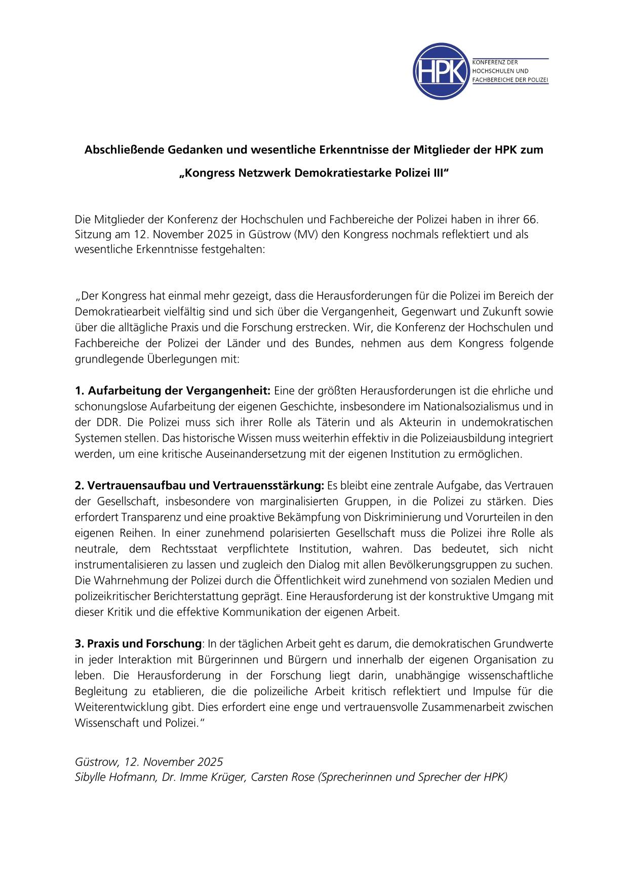 • Abschließende Gedanken und wesentliche Erkenntnisse der Mitglieder der HPK zum „Kongress Netzwerk Demokratiestarke Polizei III“